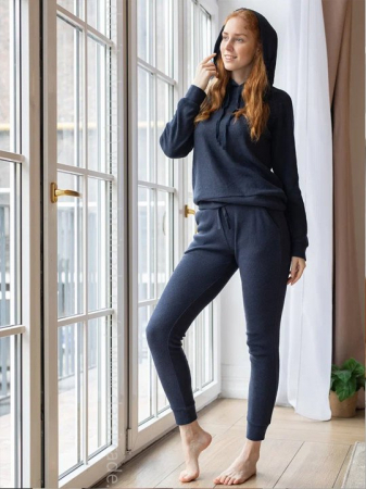 Женский костюм для дома и отдыха – худи и джоггеры. Мягкий трикотаж, визуально и тактильно аналогичный кашемиру, окунает Вас в океан безмятежности и комфорта. Брюки с карманами, на манжетах. Худи имеет кулиску в капюшоне. Рукава-реглан, на манжетах. Приглушенный темно-синий цвет выглядит благородно и дорого.