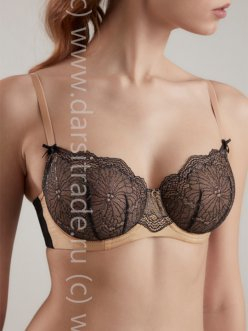 Бюстгальтер балконетной формы: мягкие чашки с вертикальными вытачками, и кареобразной линией декольте. Чашки на неэластичной сетчатой подкладке, что способствует функциональности и при этом сохранению визуальной легкости. Двойные сетчатые боковые детали стана для хорошей посадки, нижний срез обработан скрытым швом. Выполнен из тончайшего эластичного кружева с металлизированной нитью и эластичного шелковистого полотна с деликатным блеском. Праздничное звучание придает люрексовый блеск.