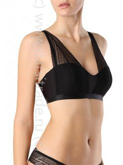 Бюстгальтер c дублированной чашкой, без каркасов. Выполнен из эластичного кружева с графическим рисунком. Чашка на подкладке из дубляжа с хлопком. Широкая поддерживающая тесьма на стане. Упругие пластины в боковых швах для хорошей посадки.