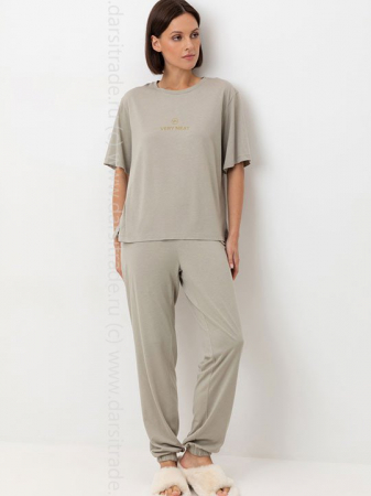 Легкий комплект для комфортного сна и отдыха. Свободная футболка стандартной длины с короткими рукавами. Брюки с манжетами выполнены из трикотажа. Гладкий материал приятен к телу и позволяет коже дышать.