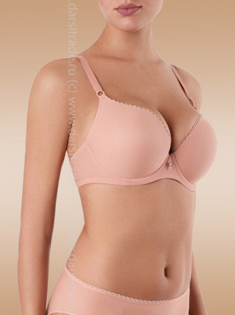 Бюстгальтер "пуш-ап" с жесткой формованной чашкой, на каркасах. Выполнен из тонкого эластичного полотна в полоску. Металлическая фурнитура. Отделка - декоративная эластичная тесьма, металлическая подвеска.