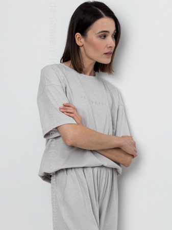 Удлиненная футболка из меланжевого трикотажа. Свободные рукава со спущенной линией плеча создают объём и свободный силуэт. Принт изготовлен из стойких текстильных красителей.