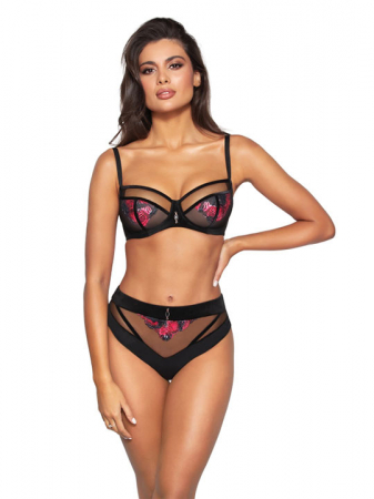 Бюстгальтер Herrera №02 PU выполнен на косточках, чашки шитые, нижняя часть на тонком поролоне телесного цвета, внешняя и верхняя часть чашек из черной сетки, швы и резинки декорированы тонкими бархатными резинками в тон и цветной вышивкой с люрексом, которая тонко прикрывает чувствительные части тела, оставляя место для фантазий о том, что невидимо глазу.