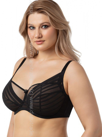 Бюстгальтер на каркасах с мягкой чашкой. Чашки оригинального конструктивного решения: внутренняя с вертикальным рельефом и вытачкой создаёт округлую форму. Лёгкая сетчатая структура использованного в ней материала позволяет коже дышать под изделием. Наружная чашка с диагональным членением из купонного полотна с графическим рисунком создаёт дополнительную поддержку. Широкий стан с боковыми упругими пластинами плотно облегает тело и обеспечивает стабильную комфортную посадку бюстгальтера на фигуре.