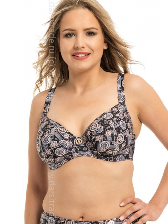 Бюст для пляжного отдыха 2415 мягкий, на косточках, с дополнительными боковыми поддержками, продублирован корректирующей сеткой, бретельки регулируются по длине, на спине застёжка, фурнитура металлическая цвета черного никеля.