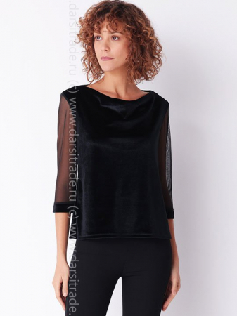 Кофта свободного силуэта с рукавом 3/4. Выполнена из полотна и эластичной сетки.