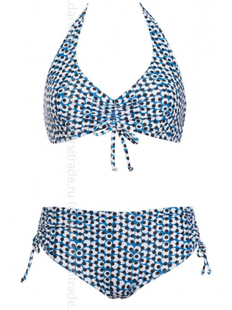 Раздельный купальник: бюстгальтер-триангул и трусики-слип, высота бочков регулируетя кулиской на 5-11 см (высокая и средняя посадка). Бретель через шею. Застежка - поворотный замок.