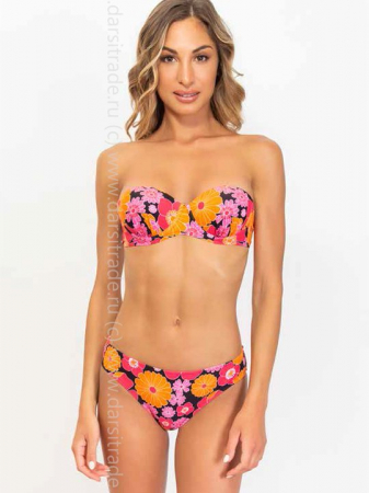 Раздельный купальник: бюстгальтер-фашия с градуированной чашкой (небольшой пуш-ап), на косточках. Отстегивающаяся бретель через шею. Застежка- завязка на спинке. Трусики-слип со средней линией талии, высота бочка 5 см.