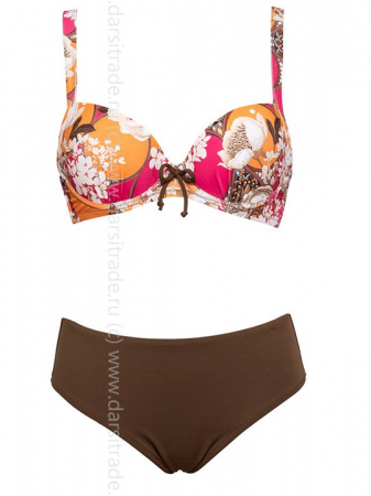 Раздельный купальник: бюстгальтер-балконет с формованной чашкой (без пуш-ап) на косточках. Боковые детали усилены косточками. Регулируемые бретели с двойным вариантом завязывания. Застежка - поворотный замок. Трусики-слип, высота бочка 9 см (средняя посад