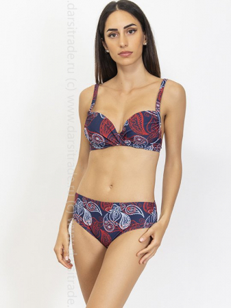 Раздельный купальник: бюстгальтер-балконет с формованной чашкой (без пуш-ап) на косточках. Боковые детали усилены косточками. Регулируемые бретели с двойным вариантом завязывания. Застежка - поворотный замок. Трусики-слип со средней линие талии, высота бо