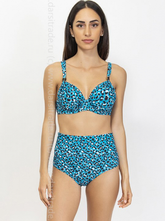 Раздельный купальник: бюстгальтер на косточках с мягкой чашкой, по пройме регулируемая сборка. Бочок усилен костью. Отстегивающиеся бретели с двойным вариантом завязывания. Застежка- поворотный замок. Трусики-слип с отворачивающимся поясом на высоту 10-16