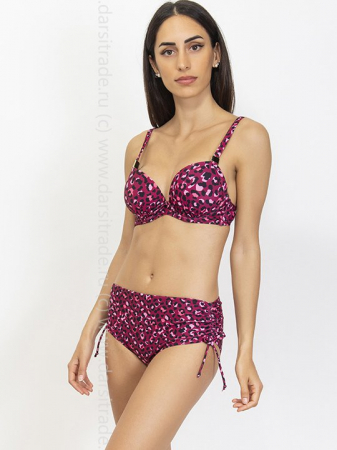 Раздельный купальник: бюстгальтер-балконет с формованной чашкой (без пуш-ап) на косточках. Боковые детали усилены косточками. Отстегивающиеся бретели с двойным вариантом завязывания. Застежка - поворотный замок. Трусики-слип, высота бочков регулируетя кул