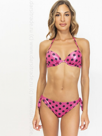 Раздельный купальник: бюстгальтер с формованной чашкой (без пуш-ап) на косточках и трусики-слип на завязках. Бретели с двойным вариантом завязывания. Застежка - завязка на спинке. Выполнен из тонкой микрофибры с золотистым напылением.
