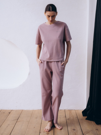 Пижама женская сиреневая, изготовленная из полиэстера, выполнена с фактурной тканью. Комплект включает в себя футболку с брюками. Футболка прямого свободного кроя на груди украшена вышивкой в виде надписи «open on». Брюки прямого свободного кроя на мягкой эластичной резинке крепко держатся на талии, не оставляя следов. По бокам брюк имеются два кармана. Фактура ткани пижамы выполнена в рубчик.
