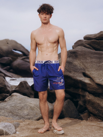 Шорты мужские пляжные, изготовленные из полиэстера, выполнены в синем цвете. На талии имеется широкая эластичная резинка с регулирующим шнурком. По бокам расположены два кармана. На внутренней части шорт имеется сетка с вырезами для ног, на задней части шорт имеются два отверстия. Спереди шорты украшены принтом с изображением якоря и надписью.