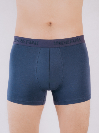 Мужские трусы изготовлены из хлопка, выполнены в синем цвете. Трусы боксеры средней посадки имеют широкую эластичную резинку на талии. Резинка украшена надписью «INDEFINI».