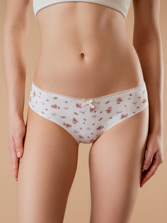 Трусы слипы женские изготовлены из смесовой ткани c перфорацией. Они имеют среднюю посадку с тонкой мягкой резинкой на талии. На внутренней стороне трусов расположена хлопковая ластовица. Спереди имеется белый декоративный бантик. На трусы слипы нанесён принт с изображением цветов и стрекоз.