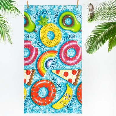 Что такое авторский дизайн вафельного полотна «Релакс»? Это компания из модных донатсов, кусочков пиццы, стильных авокадо, ананасов и бананов. Они веселятся на фоне водной лазури. И от них так и веет счастьем и релаксом. Именно поэтому вафельное полотенце «Релакс» - отличный вариант для отдыхающих.