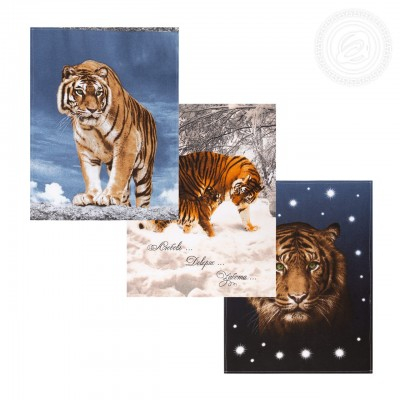 На полотенцах из рогожки - дизайн «Раджа» с полосатыми хищниками. Новогодний текстиль выглядит контрастно и красочно. Нежные бежевые оттенки переплетаются с темно-синими фонами и ярким окрасом зверей.