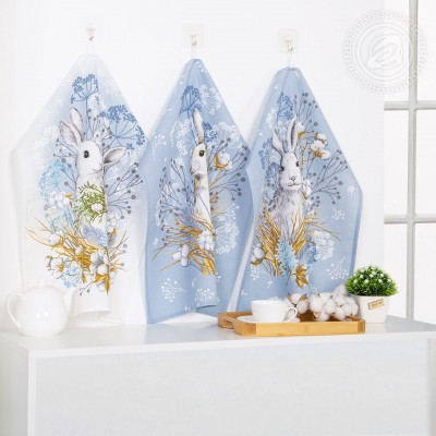 Полотенца из рогожки «Роджер» в нежной цветовой палитре дополнены очаровательным и милым дизайном с самыми пушистыми и обаятельными зайчишками на фоне хлопка и одуванчиков. Рисунок выглядит воздушно, изящно, атмосферно.