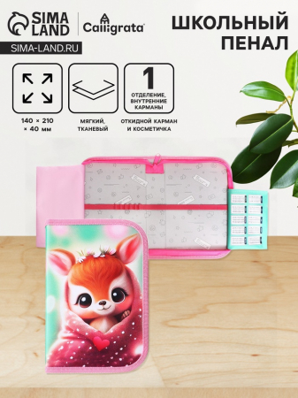 Пенал 1 секция 140?210?40 мм, откидной карман, косметичка, тканевый, Calligrata TOP Content «Олененок» (арт. 10128916)