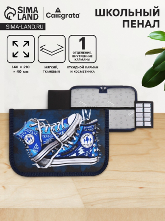 Пенал 1 секция 140 х 210 х 40 мм, откидной карман и косметичка, тканевый, Calligrata TOP Content "Кеды" (арт. 10128911)