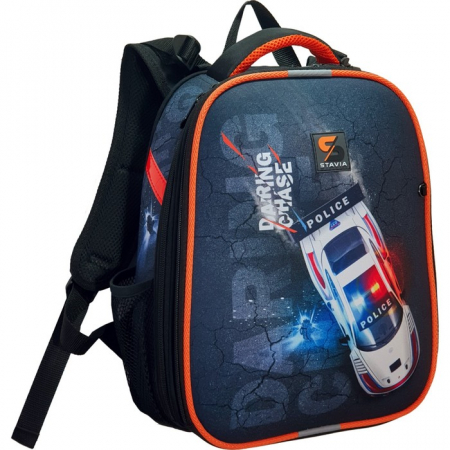 Ранец изготовлен из формованного EVA-материала и высокопрочного непромокаемого полиэстера. Размер 30 х 38 х 16 см. Вес 900 г. Прочные формованные стенки и дно ранца позволяют надежно защитить содержимое от влаги, загрязнений и предотвращают его замятие. Ранец с двумя вместительными отделениями, закрывающимися на реверсивную пластиковую молнию с металлическими «бегунками»; в первом — «плавающие» перегородки для тетрадей и учебников, во втором – большой карман из сетки и карманы-органайзеры для канцелярских принадлежностей. Плотная спинка с анатомическими элементами дополнительно укреплена пластиком, сверху – дышащая трехслойная сетка. Лямки-маечка плотные, мягкие. Регулируются по длине и высоте, что позволяет без труда отрегулировать их по росту ребенка. Ранец снабжен надежным нагрудным фиксатором. Есть удобная мягкая ручка для переноски и дополнительная петлевая ручка для размещения ранца на крюке. На дне ранца есть две пластиковые ножки. В соответствии с требованиями к безопасности на дороге, ранец имеет светоотражающие элементы на лямках и корпусе.