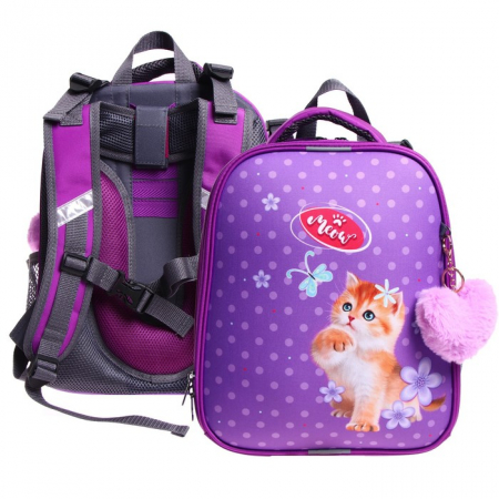 Ранец изготовлен из формованного EVA-материала и высокопрочного непромокаемого полиэстера. Размер 30 х 38 х 16 см. Вес 900 г. Прочные формованные стенки и дно ранца позволяют надежно защитить содержимое от влаги, загрязнений и предотвращают его замятие. Ранец с двумя вместительными отделениями, закрывающимися на реверсивную пластиковую молнию с металлическими «бегунками»; в первом — «плавающие» перегородки для тетрадей и учебников, во втором – большой карман из сетки и карманы-органайзеры для канцелярских принадлежностей. Плотная спинка с анатомическими элементами дополнительно укреплена пластиком, сверху – дышащая трехслойная сетка. Лямки-маечка плотные, мягкие. Регулируются по длине и высоте, что позволяет без труда отрегулировать их по росту ребенка. Ранец снабжен надежным нагрудным фиксатором. Есть удобная мягкая ручка для переноски и дополнительная петлевая ручка для размещения ранца на крюке. На дне ранца есть две пластиковые ножки. В соответствии с требованиями к безопасности на дороге, ранец имеет светоотражающие элементы на лямках и корпусе.