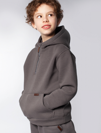 Худи выполнено из премиального футера-трехнитки с начесом. Теплая модель дополнена удобным карманом кенгуру и темно-серебристой молнией на вороте. Благодаря регулировке воротника можно носить изделие по-разному, как джемпер и как худи. Сочетайте в костюме с брюками M44.030