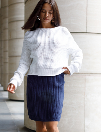Юбка фактурной вязки выполнена из мягкой хлопковой пряжи с добавлением акрила. Изделие дополнено трикотажной подкладкой, в поясе вставлена эластичная резинка, что гарантирует абсолютный комфорт при носке. Сочетайте в костюме с жакетом D31.387 чтобы получить завершённый элегантный образ.