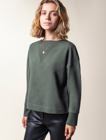 Укороченный свитшот благородного темно-оливкового оттенка со спущенной линией плеч и горловиной формы лодочка, выполнен из эластичного футера. Спереди модель дополнена декоративной вставкой из трикотажа в рубчик. Внизу металлический логотип бренда. Сочетайте в костюме с брюками D44.127 или носите отдельно, с денимом, классическими брюками или юбкой из футера.