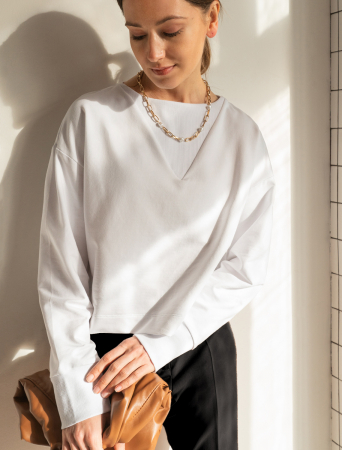 Белый укороченный свитшот со спущенной линией плеч и горловиной формы лодочка, выполнен из эластичного футера. Спереди модель дополнена декоративной вставкой из трикотажа в рубчик. Внизу металлический логотип бренда. Сочетайте в костюме с брюками D44.127 или носите отдельно, с денимом, классическими брюками или юбкой из футера.