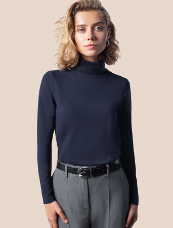Однотонная водолазка глубокого синего цвета выполнена из премиального хлопка с добавлением эластичных волокон. Гладкий трикотаж обеспечит гарантированный комфорт и удобство в использовании. Внизу изделия металлическая нашивка с логотипом бренда. Совет стилиста: водолазка может заменить рубашку в нестрогом офисном образе или подружиться с джинсами-трубами, жилетом и кедами в расслабленном повседневном наряде.