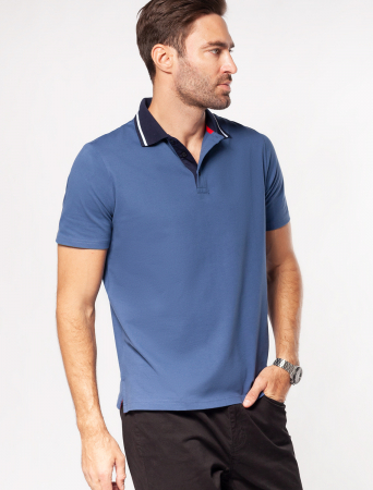 Светло-синее прямое поло выполнено из премиального хлопка пике с характерной фактурой, которая обеспечивает эффективную циркуляцию воздуха. Деликатный акцент в модели выполнен в виде контрастного отложного воротника. Наличие эластана в составе изделия способствует эластичности и меньшей сминаемости. Внизу металлический логотип бренда.