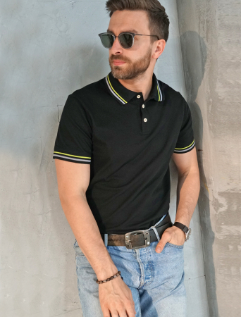Черное прямое поло выполнено из премиального хлопка пике с характерной фактурой, которая обеспечивает эффективную циркуляцию воздуха. Деликатный акцент в модели выполнен в виде плетения контрастных полос на воротнике. Наличие эластана в составе изделия способствует эластичности и меньшей сминаемости. Внизу металлический логотип бренда.