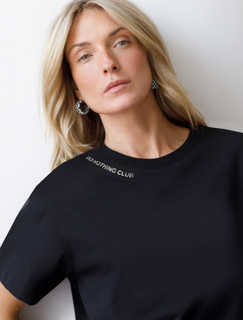 Перевод принта: Do nothing club - клуб любителей отдыха. Футболка выполнена из премиального хлопка. Авторский принт нанесен фактурными красками с устойчивым покрытием. Наличие эластана в составе гарантирует комфорт и формоустойчивость. Изделие дополнено фирменным металлическим логотипом бренда.