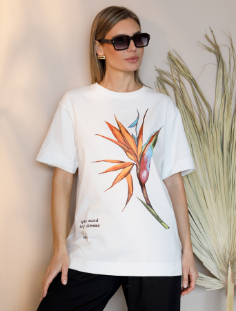 Футболка свободного кроя выполнена из премиального хлопка. Авторский принт нанесен красками с устойчивым покрытием. Перевод: «Open mind, big dreams, wild heart - Широкий взгляд, большие мечты, свободное сердце» Наличие эластана в составе гарантирует абсолютный комфорт и долговечность изделия. Модель дополнена металлическим логотипом бренда.