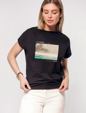 Футболка с цельнокроеным рукавом выполнена из премиального хлопка с эластаном. Авторский принт нанесен красками с устойчивым покрытием. Изделие отлично держит форму, почти не мнется и комфортно сидит по фигуре. Отдельным украшением служит металлический логотип бренда.