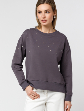 Свитшот выполнен из эластичного футера двухнитки. Изделие дополнили лаконичным принтом стразами в тон изделия. Расслабленный стиль поддерживает спущенная линия плеча, свободный силуэт и разрезы по бокам. Модель сочетается в костюме с брюками D44.135, D44.136, D44.137 и юбкой D46.034
