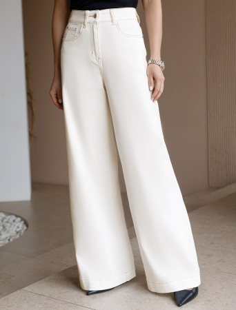 Джинсы-трубы в теплом белом оттенке выполнены из эластичного денима. Модель в теплом белом оттенке дополнена контрастными бежевыми строчками. Посадка на талии и свободный крой подчеркивают фигуру и вытягивают силуэт. Изделие дополнено фирменным патчем.