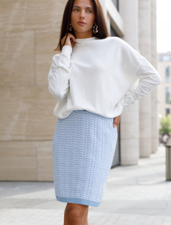 Юбка фактурной вязки выполнена из мягкой хлопковой пряжи с добавлением акрила. Изделие дополнено трикотажной подкладкой, в поясе вставлена эластичная резинка, что гарантирует абсолютный комфорт при носке. Сочетайте в костюме с жакетом D31.387 чтобы получить завершённый элегантный образ.