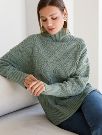 Свитер выполнен из хлопковой пряжи крупной резной вязки. Мягкая фактура свитера очень комфортная к телу, абсолютно не колется и позволяет носить изделие даже на голое тело. Добавление акрила в состав изделия способствует шелковистости и дополнительному теплу. Трендовый геометрический узор отлично впишется в осенне-зимний гардероб.