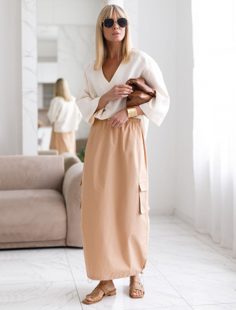 Трендовая юбка «карго» с поясом на резинке выполнена из плотного поплина. Низ изделия сделан на кулиске, что позволяет регулировать форму, используя платье по-разному в зависимости от образа. Материал прочный и износостойкий, но при этом мягкий и удобный, отлично подходит для повседневной носки, гарантируя абсолютный комфорт. Модель дополнена боковыми и двумя накладными карманами.