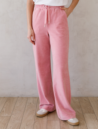 Прямые брюки выполнены из велюра. Модель с широким поясом дополнена шнурком из репсовой ленты и серебристой фурнитурой. Легкий и мягкий материал с матовой фактурой придает изделию нежность и комфорт. Хорошо держит тепло и форму – идеальное решение для домашнего отдыха. Сочетается в костюме с худи D49.053