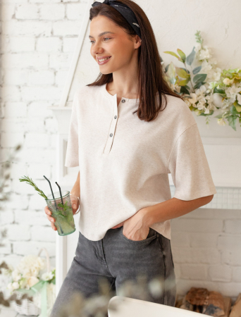 Футболка выполнена из фактурного трикотажа в рубчик. Модель свободного кроя дополнена пуговицами с логотипом бренда. Благодаря мягкой хлопковой ткани в рубчик, футболка очень приятная к телу. Эластан в составе гарантирует комфорт и формоустойчивость изделия. Сочетается в костюме с шортами D48.007 и брюками D44.121