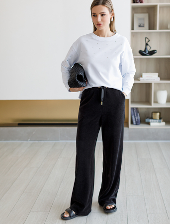 Прямые брюки выполнены из велюра. Модель с широким поясом дополнена шнурком из репсовой ленты и серебристой фурнитурой. Легкий и мягкий материал с матовой фактурой придает изделию нежность и комфорт. Хорошо держит тепло и форму – идеальное решение для домашнего отдыха. Сочетается в костюме с худи D49.053