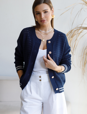 Кардиган узорной вязки выполнен из хлопковой пряжи. Модель украшена крупными пуговицами цвета теплое серебро. Благодаря натуральному составу и фактурному узору в изделии будет не жарко и очень комфортно весной и летом. Можно носить как первый слой или поверх топа. Фирменный логотип бренда.