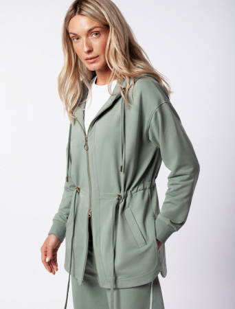 Парка выполнена из эластичного футера двухнитки. Модель дополнена золотистой фурнитурой высокого качества с логотипом бренда. Как у классической модели, изделие с капюшоном, боковыми карманами и регулируемым поясом на хлопковом шнурке. Сочетается в костюме с брюками D44.136, D44.137 и юбкой D46.034