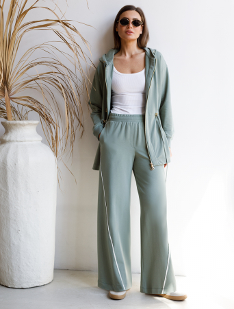 Брюки свободного кроя с контрастными лампасами выполнены из эластичного футера двухнитки. Модель дополнена боковыми карманами. Пояс на резинке фиксируется внутренним хлопковым шнуром. Диагональные визуально стройнят силуэт, а образ становится динамичным. Сочетайте изделие в костюме с паркой D49.076 и свитшотом D49.073