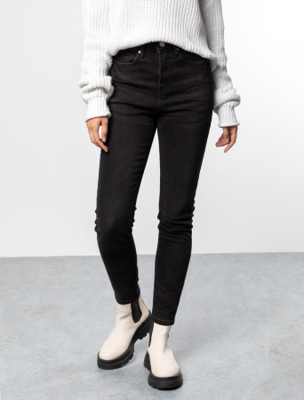 Черные слегка укороченные супер-эластичные джинсы skinny. В состав добавлены стрейчевые волокна, поэтому материал тянется, а модель комфортно садится по фигуре и не сковывает движения. Хорошо будут в сочетании с футболкой, блузкой или свитшотом и с обувью на низком каблуке.